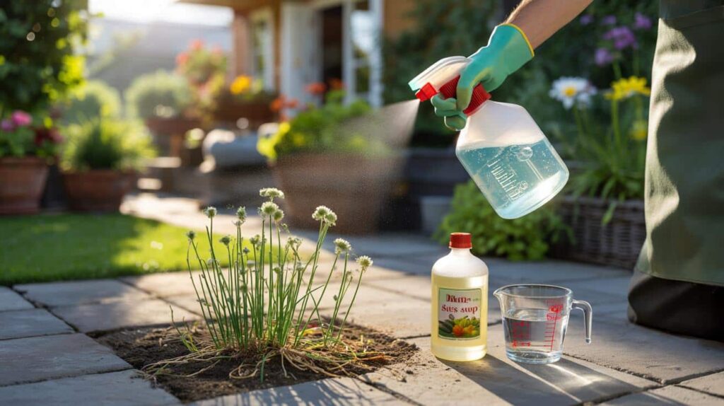 Diese Mischung in eine Sprühflasche füllen und gezielt auf die unerwünschten Pflanzen sprühen, idealerweise an einem trockenen, sonnigen Tag.