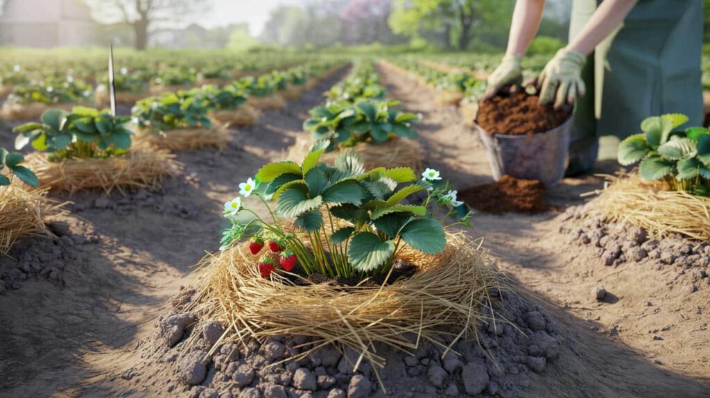 Mulch ist einer der effektivsten Schritte, um Erdbeerpflanzen langfristig zu schützen und ihre Produktivität zu steigern. Die schützende Schicht wirkt wie eine natürliche Barriere gegen Unkraut, Feuchtigkeitsverlust und Krankheiten. Idealerweise wird sie bis Ende März aufgebracht, bevor die Blüte beginnt.